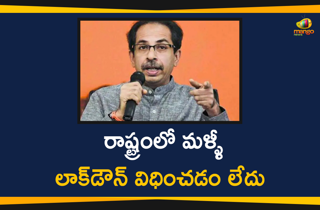 మహారాష్ట రాష్ట్రంలో మరోసారి లాక్డౌన్ను విధించడం లేదని ఆ రాష్ట్ర సీఎం ఉద్ధవ్ థాకరే ఈ రోజు స్పష్టం చేశారు. ఈ మేరకు మహారాష్ట్ర సీఎంఓ కార్యాలయం అధికారిక ఖాతా నుంచి ట్వీట్ చేసింది. మహారాష్ట్రలో కరోనా కేసుల సంఖ్య లక్షకు చేరువవడంతో రాష్ట్రంలో మరోసారి పూర్తిస్థాయి లాక్డౌన్ విధిస్తారంటూ వదంతులు వస్తున్న నేపథ్యంలో సీఎం ఉద్ధవ్ థాకరే స్పష్టత నిచ్చారు. అయితే రాష్ట్రంలో పెద్ద సంఖ్యలో కరోనా కేసులు నమోదవుతున్న నేపథ్యంలో ప్రజలు గుంపులుగా గుమికూడకూడదని, అన్ని చోట్ల భౌతిక దూరం పాటించాలని సీఎం ఉద్ధవ్ థాకరే సూచించారు. కరోనా నియంత్రణకు ప్రభుత్వం జారీ చేసిన నిబంధనలను తప్పనిసరిగా పాటించాలని, అవసరమైన అన్ని జాగ్రత్తలు తీసుకోవాలని ప్రజల్ని ఆయన అభ్యర్థించారు.