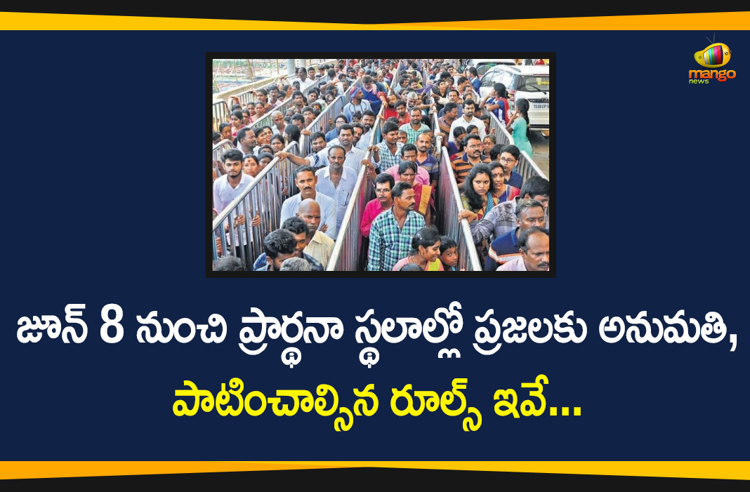 దేశవ్యాప్తంగా కంటైన్మెంట్ జోన్లలో మినహా ఈ నెల 8వ తేదీ నుంచి మతపరమైన ప్రదేశాలు / ప్రార్థనా స్థలాలు, హోటళ్లు, రెస్టారెంట్లు, షాపింగ్ మాల్స్ తెరిచేందుకు కేంద్రప్రభుత్వం అన్ని రాష్ట్రాలు/కేంద్రపాలిత ప్రాంతాలకు అనుమతి ఇచ్చిన సంగతి తెలిసిందే. ఈ నేపథ్యంలో అన్ని రకాల ప్రార్థనా స్థలాల్లో చేయాల్సిన ఏర్పాట్లు, ప్రజలు పాటించాల్సిన నిబంధలను కేంద్ర ఆరోగ్య, కుటుంబ సంక్షేమ మంత్రిత్వ శాఖ ప్రకటించింది.