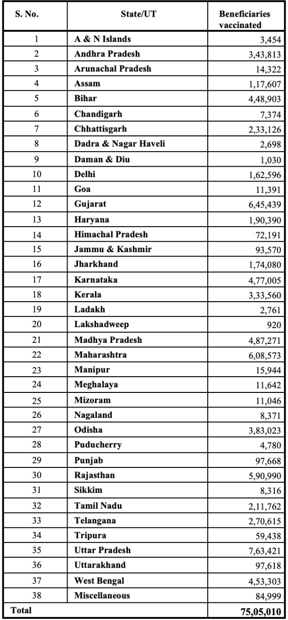 మొత్తం ఇప్పటికి దాకా కరోనా వ్యాక్సినేషన్ లో 10 రాష్ట్రాల నుంచే 69.34 % లబ్ధిదారులు ఉన్నట్టు పేర్కొన్నారు. అందులో అత్యధికంగా ఉత్తరప్రదేశ్ రాష్ట్రంలోనే (7,63,421) మందికి వ్యాక్సిన్ ఇచ్చినట్టు తెలిపారు. ఇక ఆంధ్రప్రదేశ్ లో ఇప్పటికి 3,25,538 మంది, తెలంగాణలో 2,43,665 మంది లబ్ధిదారులకు కరోనా వ్యాక్సిన్ వేశారు.
