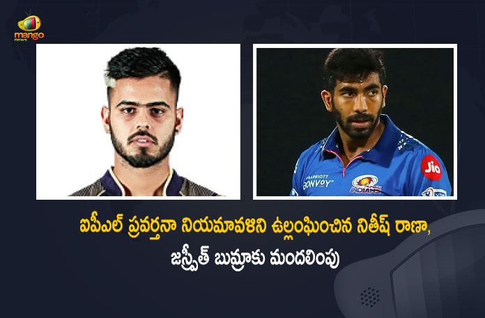 ఇండియన్ ప్రీమియర్ లీగ్ (ఐపీఎల్)-2022 ఆసక్తికరంగా సాగుతున్న తెలిసిందే. ఈ క్రమంలో ఏప్రిల్ 6, బుధవారం రాత్రి ముంబయి ఇండియన్స్, కోల్కతా నైట్ రైడర్స్ జట్ల మధ్య పూణేలో జరిగిన మ్యాచ్ సందర్భంగా ఐపీఎల్ ప్రవర్తనా నియమావళిని ఉల్లంఘించినందుకు నితీష్ రాణా మరియు జస్ప్రీత్ బుమ్రాను మందలించబడ్డారు. ఈ మేరకు ఐపీఎల్ టోర్నీ నిర్వాహకులు ఒక ప్రకటన విడుదల చేశారు. కోల్కతా నైట్ రైడర్స్కు చెందిన నితీష్ రాణాను మందలించడంతో పాటుగా అతని మ్యాచ్ ఫీజులో 10 శాతం జరిమానా విధించబడిందని పేర్కొన్నారు. నితీష్ రాణా ఐపీఎల్ ప్రవర్తనా నియమావళి యొక్క లెవల్ 1 నేరాన్ని అంగీకరించాడని, మరియు చర్యలను ఆమోదించాడని తెలిపారు.