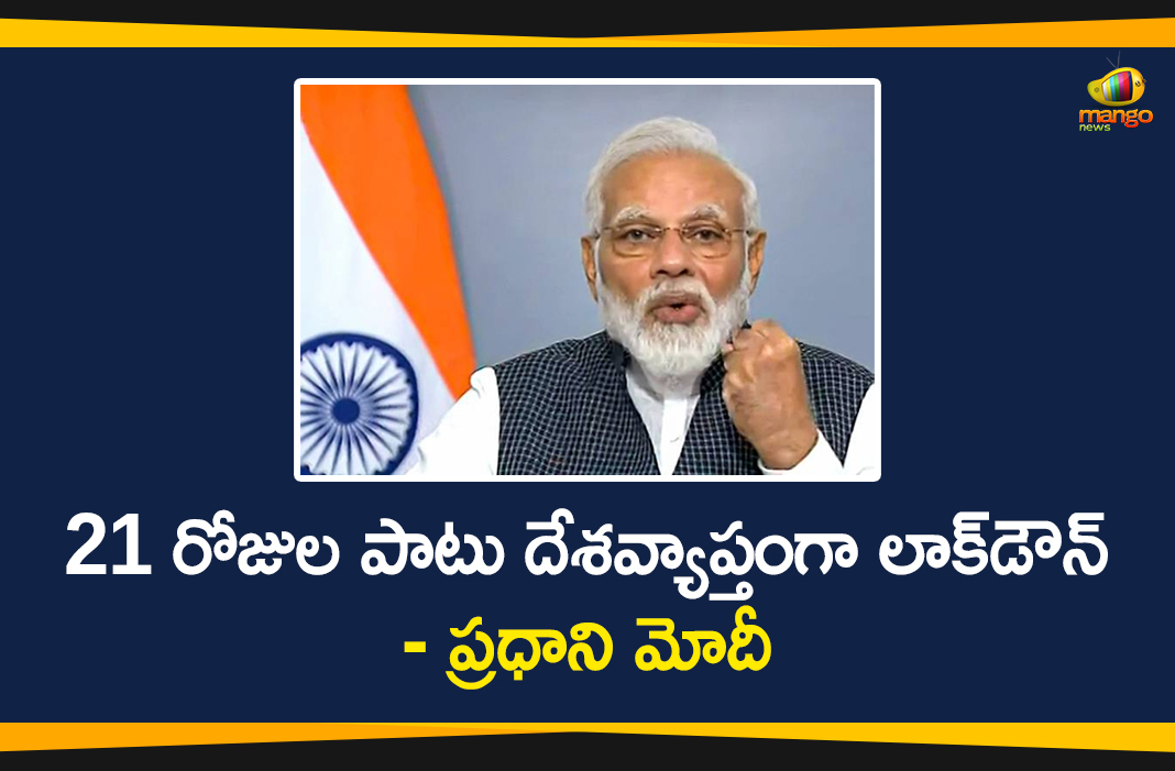 - మార్చ్ 24, మంగళవారం నాడు అర్ధరాత్రి 12 గంటల నుంచి దేశం మొత్తం లాక్డౌన్. ఇళ్ల నుంచి బయటకు రావడం పూర్తిగా నిషేధం.