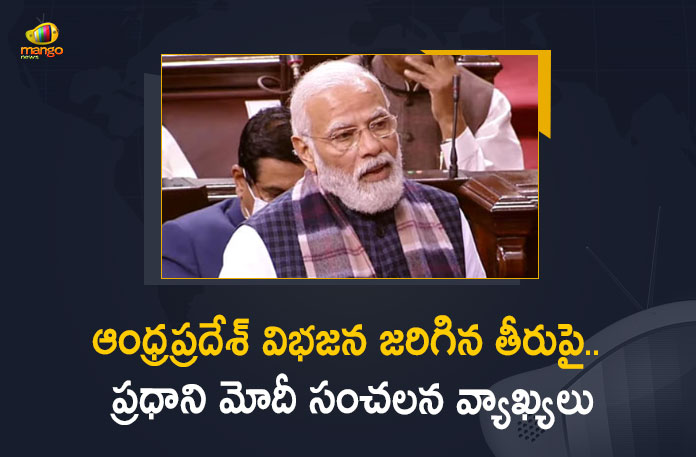 ప్రధానమంత్రి నరేంద్ర మోదీ మరోసారి కాంగ్రెస్ వైఖరిపై మండిపడ్డారు. నిన్న లోక్సభలో ఆ పార్టీ తీరును ఎండగట్టిన ప్రధాని మోదీ.. ఈరోజు రాజ్యసభలో మరోసారి కాంగ్రెస్ విధానాలను ప్రశ్నించారు. కాంగ్రెస్ పార్టీ, ఆంధ్రప్రదేశ్ ను హడావిడిగా విభజించి.. ఆ రాష్ట్రానికి చాలా అన్యాయం చేసిందని ప్రధాని మోదీ దుయ్యబట్టారు. రాష్ట్రపతి రామ్నాథ్ కోవింద్ పార్లమెంటు ఉభయ సభలను ఉద్దేశించి చేసిన ప్రసంగానికి ధన్యవాదాలు తెలిపే తీర్మానంపై చర్చలో ప్రధాని మోదీ పాల్గొన్నారు. ఈ సందర్భంగా.. మంగళవారం రాజ్యసభలో ప్రసంగించిన ప్రధాని కాంగ్రెస్ పార్టీపై నిప్పులు చెరిగారు. ఆనాడు కేంద్రంలో అధికారంలో ఉన్న కాంగ్రెస్ ప్రభుత్వం తీసుకున్న లోపభూయిష్ట విధానాలతో రెండు తెలుగు రాష్ట్రాలు ఇప్పటికీ కష్టాల్లోనే ఉన్నాయని ప్రధానమంత్రి నరేంద్ర మోదీ అన్నారు.