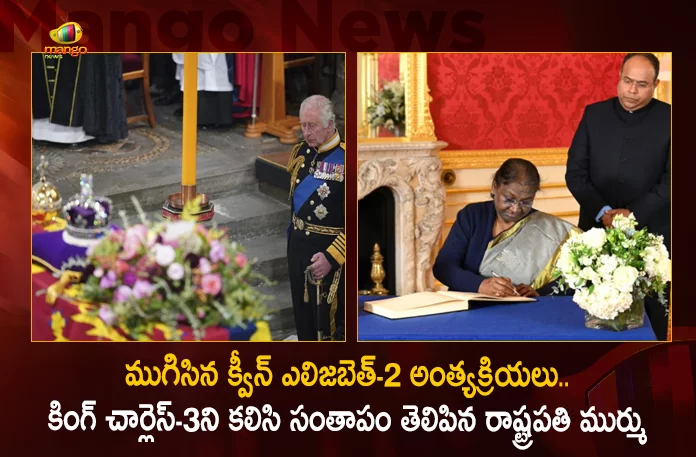 రాణి శవపేటికతోపాటు కింగ్ అండ్ క్వీన్ కన్సార్ట్, ప్రిన్స్ అండ్ ప్రిన్సెస్ ఆఫ్ వేల్స్ మరియు ఇతర రాజకుటుంబ సభ్యుల కారు ఊరేగింపుగా వెస్ట్మినిస్టర్ అబ్బే చేరుకుంది. ఇక చివరిగా రాణి కుటుంబంతో పాటు సన్నిహితుల సమక్షంలో క్వీన్ ఎలిజబెత్-2కి వీడ్కోలు పలికి ఖననం చేశారు. గతేడాది మరణించిన రాణి భర్త ఫిలిప్ సమాధి పక్కన ఆమెను ఖననం చేయడం గమనార్హం. కాగా బ్రిటన్ను సుదీర్ఘకాలం పాలించిన ఆమెకు వీడ్కోలు పలికేందుకు ప్రపంచవ్యాప్తంగా అనేకమంది నాయకులు లండన్ చేరుకున్నారు. అమెరికా అధ్యక్షుడు జో బైడెన్, భారత రాష్ట్రపతి ద్రౌపది ముర్ము సహా దాదాపు 2 వేల మంది ప్రముఖులు హాజరయ్యారు. ఇక రాష్ట్రపతి ద్రౌపది ముర్ము లండన్లో కింగ్ చార్లెస్-3ని కలుసుకుని దేశం తరపున సంతాపం వ్యక్తం చేశారు. లాంకాస్టర్ హౌస్లో హర్ మెజెస్టి ది క్వీన్ ఎలిజబెత్-2 జ్ఞాపకార్థం సంతాప పుస్తకంపై సంతకం చేశారు.