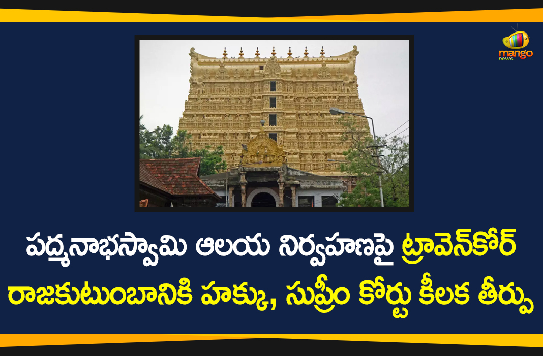 కేరళలోని తిరువనంతపురంలో ఉన్న అనంత పద్మనాభస్వామి ఆలయం నిర్వహణకు సంబంధించి సుప్రీం కోర్టు జూలై 13, సోమవారం నాడు కీలక తీర్పు వెల్లడించింది. ఆలయ నిర్వహణ, ఆలయం ఆస్తుల్లో హిందూధర్మ చట్టం ప్రకారం ట్రావెన్కోర్ రాజకుటుంబానికి హక్కు ఉన్నట్లు సుప్రీంకోర్టు వెల్లడించింది. గత కొన్ని సంవత్సరాలుగా ఈ ఆలయ ఆస్తులు, నిర్వహణ విషయంలో హక్కుల కోసం ట్రావెన్కోర్ రాజ కుటుంబం, కేరళ ప్రభుత్వానికి సంబంధించిన వివాదంపై విచారణ జరుగుతుంది. ఈ నేపథ్యంలో రాజకుటుంబానికి అనుకూలంగా సుప్రీంకోర్టు ఈ రోజు తీర్పు వెల్లడించింది. అలాగే ఆలయ పాలనా వ్యవహారాలను చూసేందుకు త్రివేండం జిల్లా జడ్జి ఆధ్వర్యంలో ఒక కమిటీని కోర్టు ఏర్పాటు చేసింది. కొత్త కమిటీ ఏర్పాటయ్యే వరకు ఆలయ వ్యవహారాలను ఈ కమిటీ పర్యవేక్షిస్తుందని సుప్రీం కోర్టు ఆదేశాలు ఇచ్చింది.
