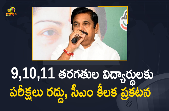 ఈ ఏడాది విద్యార్థుల వార్షిక పరీక్షలకు సంబంధించి తమిళనాడు సీఎం పళనిస్వామి గురువారం నాడు అసెంబ్లీలో కీలక ప్రకటన చేశారు. రాష్ట్రంలో 2020-21 విద్యాసంవత్సరానికి చెందిన 9, 10, 11 తరగతుల విద్యార్థులకు వార్షిక పరీక్షలను రద్దు చేయాలని రాష్ట్ర ప్రభుత్వం నిర్ణయించిందని సీఎం పళనిస్వామి ప్రకటించారు. వారికీ ఎలాంటి పరీక్షలు లేకుండా తదుపరి తరగతికి ప్రమోట్ చేయనున్నట్టు వెల్లడించారు. కరోనా మహమ్మారి నేపథ్యంలో ఎస్ఎస్ఎల్సి (పదో తరగతి), ప్లస్ వన్ (ఇంటర్ ఫస్ట్ ఇయర్) పరీక్షలను నిర్వహించడానికి పరిస్థితులు అనుకూలంగా లేవని వైద్య నిపుణులు ఇచ్చిన నివేదిక ఆధారంగా ఈ నిర్ణయం తీసుకున్నట్లు సీఎం పళనిస్వామి తెలిపారు. కాగా ఆయా తరగతుల విద్యార్థులను వారి ఇంటర్నల్ మార్క్స్ అంచనా ఆధారంగా ప్రమోట్ చేయనున్నారు.