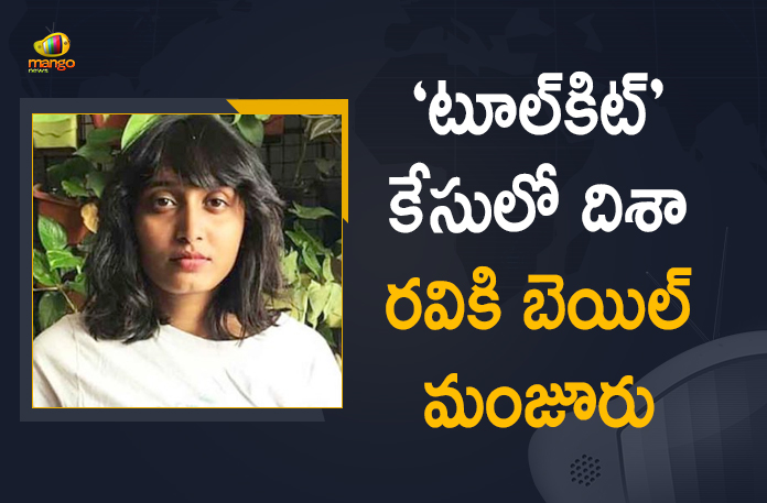 పర్యావరణ పరిరక్షణ కార్యకర్త గ్రెటా థన్బెర్గ్ సోషల్ మీడియాలో షేర్ చేసిన ‘టూల్కిట్’ కేసు దర్యాప్తులో భాగంగా బెంగళూరుకు చెందిన పర్యావరణ పరిరక్షకురాలు దిశ రవిని క్రిమినల్ కుట్ర, దేశద్రోహం కింద ఫిబ్రవరి 13 న ఢిల్లీ పోలీసులు అరెస్ట్ చేసిన సంగతి తెలిసిందే. కాగా టూల్కిట్ కేసుకు సంబంధించి దిశా రవికి ఢిల్లీలోని పటియాలా హౌస్ కోర్టు మంగళవారం నాడు బెయిల్ మంజూరు చేసింది. వ్యక్తిగత బాండ్పై లక్ష రూపాయలు, అలాగే అదే మొత్తంలో రెండు ష్యురీటిలు వంటి షరతులతో దిశా రవికి బెయిల్ మంజూరు చేశారు.
