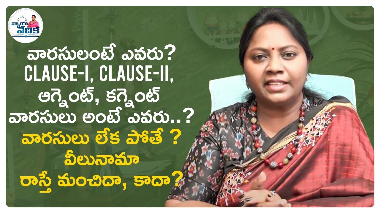 సామాజిక కార్యకర్త, ప్రముఖ న్యాయవాది అయిన ఆకుల రమ్య గారు లా అండ్ ఆర్డర్, భారతీయ చట్టాలు, చట్టపరమైన మరియు చట్టవిరుద్ధమైన కార్యకలాపాలకు సంబంధించిన అనేక అంశాల గురించి ‘న్యాయవేదిక’ పేరుతో తన యూట్యూబ్ ఛానల్ లో ఎపిసోడ్స్ వారీగా వివరణ ఇస్తున్నారు. అందులో భాగంగా ఈ ఎపిసోడ్ లో ‘వారసులు అంటే ఎవరు’ అనే అంశం గురించి విశ్లేషించారు. క్లాజ్-1, క్లాజ్-2, ఆగ్నెంట్, కగ్నెంట్ వారసులు అంటే ఎవరు?, వారసులు లేకపోతే ఏంటి?, వీలునామా రాస్తే మంచిదా? కాదా? అనే వివరాలను తెలుసుకోవాలంటే ఈ ఎపిసోడ్ ను పూర్తిగా వీక్షించండి.