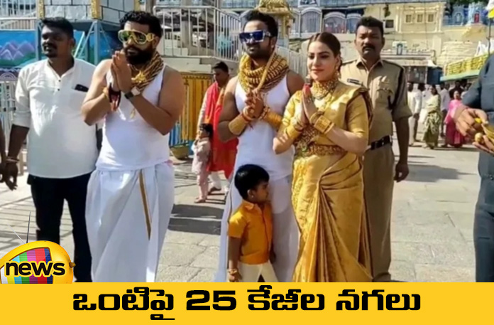 మహారాష్ట్రలోని పూణేకు చెందిన వీళ్లను గోల్డెన్ బాయ్స్ గా పిలుస్తారు. వాళ్ల ఒంటినిండా బంగారు నగలే. మెడలో తాడు లాంటి బంగారు చైన్లు ఎప్పుడు ధరిస్తారు. మోచేతుల వరకు బంగారు పట్టీలు వేసుకుంటారు. వాళ్లతో పాటు వచ్చిన మహిళ బంగారుతో చేసిన చీరెను ధరించి కనిపించారు. ఇదివరకు హిందీ బిగ్ బాస్ హౌస్లోనూ వీరు మెరుపులు మెరిపించారు. ఈ ఉదయం శ్రీవారిని దర్శించుకున్నారు. చాలాకాలంగా శ్రీవేంకటేశ్వరస్వామి ని దర్శించుకోవాలని అనుకుంటున్నారట. ఆ కోరిక నేటితో తీరిందని అన్నారు. కాగా గతేడాది కూడా మహారాష్ట్ర నుంచి ఓ కుటుంబం కూడా ఇలాగే బంగారంతో సందడి చేశారు. మహారాష్ట్రకు చెందిన సుభాష్ చంద్ర, సోనీ కుటుంబం స్వామివారి దర్శనానికి వచ్చారు. వేంకటేశ్వర స్వామి ప్రతిమలతో కూడిన బంగారు ఆభరణాలతో కనిపించారు.