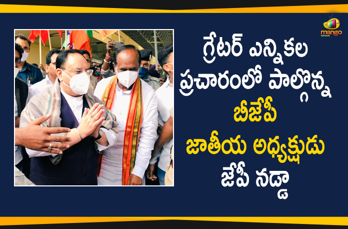 గ్రేటర్ హైదరాబాద్ మున్సిపల్ కార్పోరేషన్ (జీహెచ్ఎంసీ) ఎన్నికల ప్రచారం తుదిదశకు చేరుకోవడంతో బీజేపీ రాష్ట్రస్థాయి నాయకులతో పాటుగా జాతీయ నేతలు కూడా ప్రచారంలో పాల్గొంటున్నారు. అందులో భాగంగా బీజేపీ జాతీయ అధ్యక్షుడు జేపీ నడ్డా ఈ రోజు హైదరాబాద్ నగరానికి విచ్చేశారు. ప్రత్యేక విమానంలో బేగంపేట విమానాశ్రయానికి చేరుకున్న జేపీ నడ్డాకు పార్టీ ఓబీసీ మోర్చా జాతీయ అధ్యక్షుడు కే లక్ష్మణ్, ఎమ్మెల్యే రాజాసింగ్ తో పాటుగా పలువురు నాయకులు స్వాగతం పలికారు.
