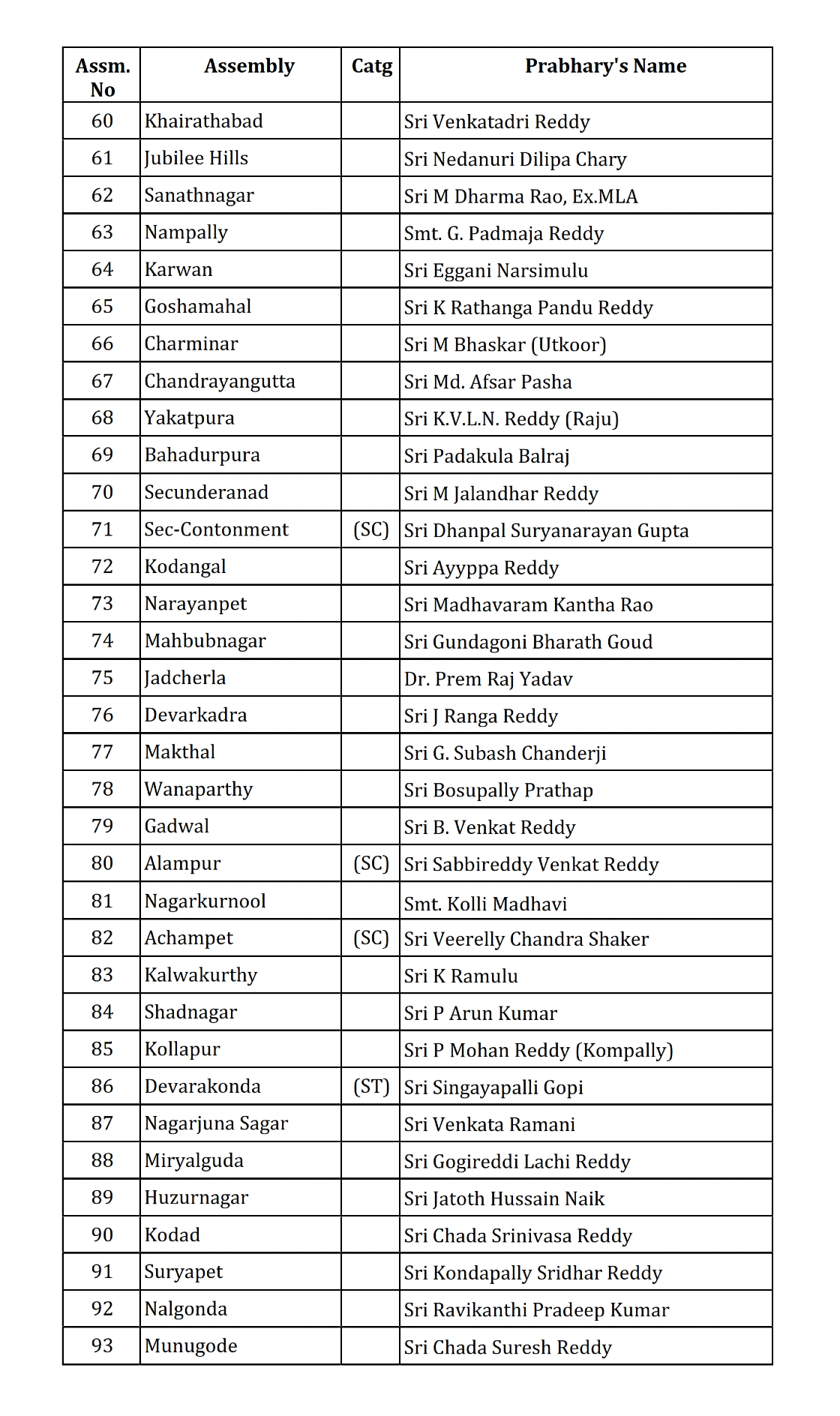 తెలంగాణలో 119 అసెంబ్లీ నియోజ‌క‌వ‌ర్గాల‌కు బీజేపీ ఇంచార్జ్ లు నియామకం, జాబితా ఇదే…