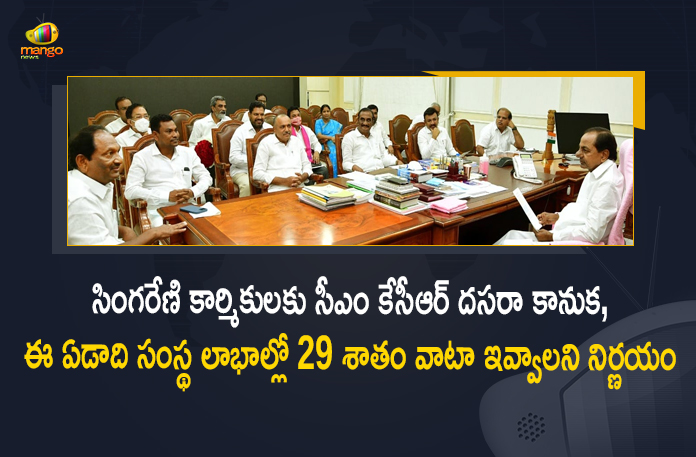 సింగరేణి సంస్థ ఈ ఏడాది ఆర్జించిన లాభాల్లో కార్మికులకు 29 శాతం వాటాను ఇవ్వాలని ముఖ్యమంత్రి కె.చంద్రశేఖర్ రావు నిర్ణయించారు. గత ఏడాది కంటే ఒక శాతం పెంచుతూ సింగరేణి కార్మికులకు సీఎం దసరా కానుకను అందించారు. ఈ లాభాల్లో వాటాను దసరా కన్నా ముందే చెల్లించాలని సీఎండీ శ్రీధర్ ను సీఎం కేసీఆర్ ఆదేశించారు. సింగరేణి కార్మికుల సంక్షేమానికి రాష్ట్ర ప్రభుత్వం కట్టుబడి ఉందని సీఎం పునరుద్ఘాటించారు. కార్మికుల భవిష్యత్తు దృష్ట్యా సింగరేణి సంస్థ కార్యకలాపాలను విస్తృతపరచాల్సిన అవసరమున్నదన్నారు. బొగ్గు తవ్వకంతో పాటు ఇసుక, ఇనుము, సున్నపురాయి తదితర ఖనిజాల తవ్వకాల్లోకి సింగరేణి విస్తరించాల్సిన అవసరమున్నదని సీఎం తెలిపారు. మంగళవారం నాడు ప్రగతి భవన్ లో సీఎం కేసీఆర్ అధ్యక్షతన సింగరేణిపై సమీక్ష సమావేశం జరిగింది.