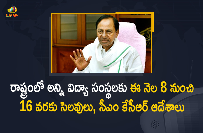 రాష్ట్రంలో కరోనా కేసులు మళ్ళీ పెరుగుతున్న నేపథ్యంలో సోమవారం నాడు వైద్య, ఆరోగ్య శాఖపై ప్రగతి భవన్ లో ముఖ్యమంత్రి కె.చంద్రశేఖర్ రావు ఉన్నతస్థాయి సమీక్ష సమావేశాన్ని నిర్వహించారు. ఈ సందర్భంగా రాష్ట్రంలో విద్యాసంస్థలకు సంక్రాంతి సెలవులపై సీఎం కేసీఆర్ కీలక నిర్ణయం తీసుకున్నారు. జనవరి 8వ తేదీ నుంచి 16వ తేదీ వరకు అన్ని విద్యా సంస్థలకు సెలవులు ఇవ్వాలని సీఎం కేసీఆర్ ఆదేశాలు ఇచ్చారు. దీంతో స్కూల్స్, కాలేజీల విద్యార్థులకు 9 రోజుల పాటు సంక్రాంతి సెలవులు రానున్నాయి.