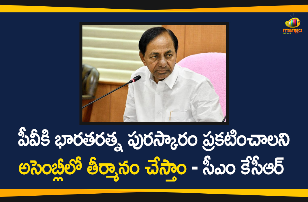 సెప్టెంబర్ నెలలో జరిగే అసెంబ్లీ సమావేశాల్లో మాజీ ప్రధాని పీవీ నరసింహారావుకు భారతరత్న పురస్కారం ప్రకటించాలని తీర్మానం చేయనున్నట్లు ముఖ్యమంత్రి కె.చంద్రశేఖర్ రావు వెల్లడించారు. నెక్లెస్ రోడ్ కు పీవీ జ్ఞాన మార్గ్ గా పేరు పెట్టాలని సీఎం నిర్ణయించారు. అలాగే హైదరాబాద్ లో పీవీ మెమోరియల్ నిర్మించనున్నట్లు వెల్లడించారు. పీవీ శత జయంతి ఉత్సవాల నిర్వహణపై శుక్రవారం నాడు సీఎం కేసీఆర్ ప్రగతి భవన్ లో సమీక్ష నిర్వహించారు.