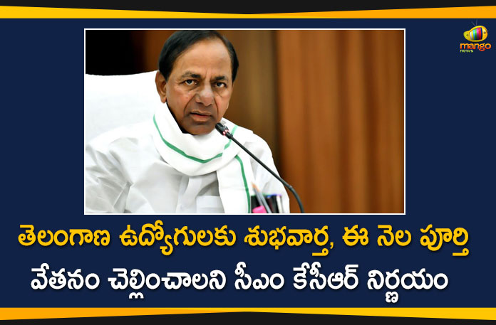 తెలంగాణ రాష్ట్ర ప్రభుత్వ ఉద్యోగులు, పెన్షనర్లకు శుభవార్త అందింది. రాష్ట్ర ఆదాయ పరిస్థితి కొంచెం కొంచెం మెరుగవుతున్నందున నేపథ్యంలో ప్రభుత్వ ఉద్యోగులకు, పెన్షనర్లకు ఈ నెల పూర్తి వేతనం చెల్లించాలని నిర్ణయించినట్లు సీఎం కె.చంద్రశేఖర్ రావు ప్రకటించారు. ఈ మేరకు ఈ నెలలో పూర్తి వేతనాలు చెల్లించాలని అధికారులను సీఎం కేసీఆర్ ఆదేశించారు.