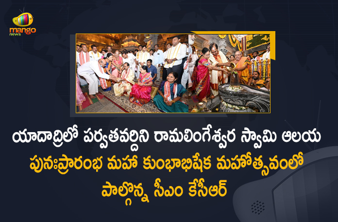 యాదాద్రి శ్రీ లక్ష్మి నరసింహస్వామి అనుబంధ ఆలయం ‘పర్వతవర్దిని సమేత రామలింగేశ్వర స్వామి ఆలయ’ పునఃప్రారంభ మహా కుంభాభిషేక మహోత్సవ కార్యక్రమంలో ముఖ్యమంత్రి కె.చంద్రశేఖర్ రావు దంపతులు పాల్గొన్నారు. అనంతరం పర్వతవర్దిని సమేత శ్రీ రామలింగేశ్వర స్పటిక లింగానికి అభిషేకం నిర్వహించారు. శివాలయ మహా కుంభాభిషేకంలో భాగంగా మధ్యాహ్నం 12.30 గంటలకు యాగశాలలో నిర్వహించిన మహా పూర్ణాహుతిలో సీఎం దంపతులు పాల్గొన్నారు. ముందుగా సోమవారం ఉదయం యాదాద్రికి చేరుకున్న సీఎం కేసీఆర్ దంపతులు తొలుత లక్ష్మీనరసింహస్వామి ఆలయానికి చేరుకున్నారు. వారికి ఆలయ అర్చకులు వేదోచ్చారణతో పూర్ణకుంభంతో స్వాగతం పలికారు. అనంతరం గర్భగుడిలో సీఎం దంపతులు పూజలు నిర్వహించారు. అనంతరం పూజారులు సీఎం దంపతులకు ఆశీర్వచనం అందించారు.