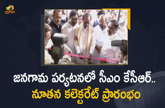 తెలంగాణ రాష్ట్రంలోని జనగామ జిల్లా పర్యటనకు సీఎం కేసీఆర్ విచ్చేశారు. ఈ పర్యటనలో భాగంగా.. జిల్లా ప్రధాన కేంద్రం జనగామ పట్టణంలో కొత్తగా నిర్మించిన సమీకృత జిల్లా కార్యాలయాల సముదాయాన్ని ముఖ్యమంత్రి కేసీఆర్ శుక్రవారం మధ్యాహ్నం ప్రారంభించారు. దీనికి ముందుగా జిల్లా పోలీసుల గౌరవ వందనాన్ని సీఎం కేసీఆర్ స్వీకరించారు. ఈ సందర్భంగా అర్చకులు పూర్ణకుంభంతో కేసీఆర్ కు స్వాగతం పలికారు. అనంతరం కలెక్టరేట్ శిలాఫలకాన్ని కేసీఆర్ ఆవిష్కరించారు. జిల్లా ప్రజలకు సత్వరంగా, సులభతరమైన సేవలందిచేందుకు గాను ఈ కలెక్టరేట్ భవనాన్ని అన్ని సదుపాయాలతో నిర్మించారు అధికారులు.