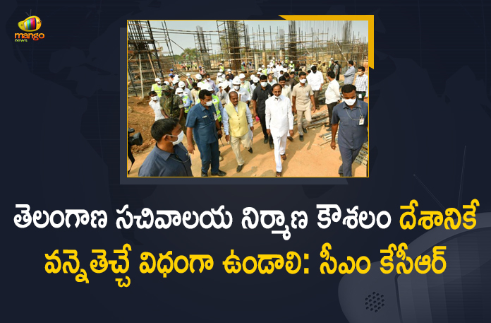 తెలంగాణ సచివాలయ నిర్మాణ కౌశలం దేశానికే వన్నెతెచ్చే విధంగా, అలంకృత రూపంతో అద్భుతంగా వుండాలని, పదికాలాల పాటు నిలిచివుండే తెలంగాణ సెక్రటేరియట్ ను పటిష్టమైన రీతిలో నిర్మించాలని ముఖ్యమంత్రి కె.చంద్రశేఖర్ రావు అన్నారు. నూతనంగా నిర్మిస్తున్న సచివాలయ పనుల పురోగతిని సీఎం కేసీఆర్ గురువారం నాడు పరిశీలించారు. సచివాలయ నిర్మాణంలో సుందరీకరణ కోసం వినియోగించేందుకు రాజస్థాన్ నుంచి తెప్పించిన రెడ్ సాండ్ స్టోన్, బీజ్ స్టాండ్ స్టోన్, నాచురల్ బీజ్, నాచురల్ గ్వాలియర్ స్టోన్స్ నమూనాలను సీఎం పరిశీలించారు. సచివాలయ నైరుతి దిక్కు ప్రాంతాన్ని కాలినడకన కలియతిరిగి, నిర్మాణంలో వున్న పిల్లర్లను, బీమ్ ల నాణ్యతను, పనితీరును పరిశీలించారు. రోడ్లు భవనాల శాఖ మంత్రి ప్రశాంత్ రెడ్డి, అధికారులు సహా వర్క్ ఏజెన్సీ ప్రతినిధులకు నిర్మాణాల్లో చేపట్టవలసిన చర్యలకు సంబంధించి పలు సూచనలు చేశారు.
