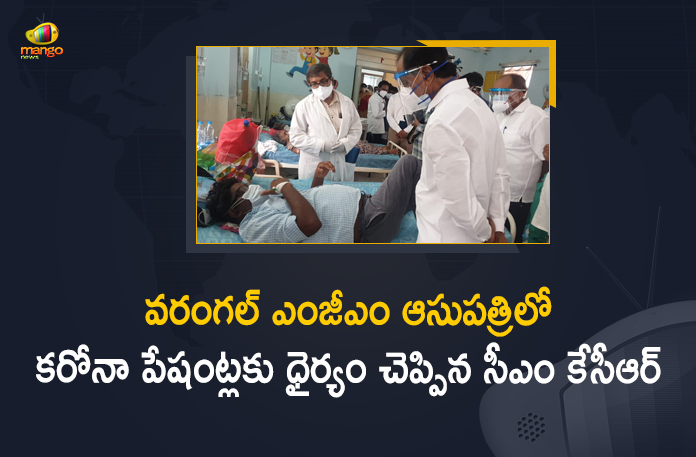 తెలంగాణ రాష్ట్ర ముఖ్యమంత్రి కె.చంద్రశేఖర్ రావు శుక్రవారం నాడు వరంగల్ లో పర్యటించారు. ఈ పర్యటనలో భాగంగా మధ్యాహ్నం 12.45 గంటలకు ఎంజీఎం దవాఖానకు చేరుకున్న సీఎం కేసీఆర్ నేరుగా కరోనా పేషంట్లు ఉన్న ఐసీయూ వార్డులోకి వెళ్లి రోగులను పరామర్శించారు. కోవిడ్ పేషంట్లకు అందుతున్న చికిత్స గురించి తెలుసుకున్నారు. కరోనాకు భయపడవద్దంటూ వారికి ధైర్యం చెప్పారు. ఈ సందర్భంగా వరంగల్ మట్టెవాడకు చెందిన కరోనా పేషంట్ వెంకటాచారి తనకు వైద్య చికిత్స బాగానే అందుతున్నదని సీఎంకు వివరించారు. కేసీఆర్ జిందాబాద్.. కేసీఆరే నా నిండు ప్రాణం అని ఆయన అన్నారు. ప్రతీ బెడ్ దగ్గరకూ వెళ్లి కరోనా రోగులకు అందుతున్న వైద్య సేవలను సీఎం అడిగి తెలుసుకున్నారు.