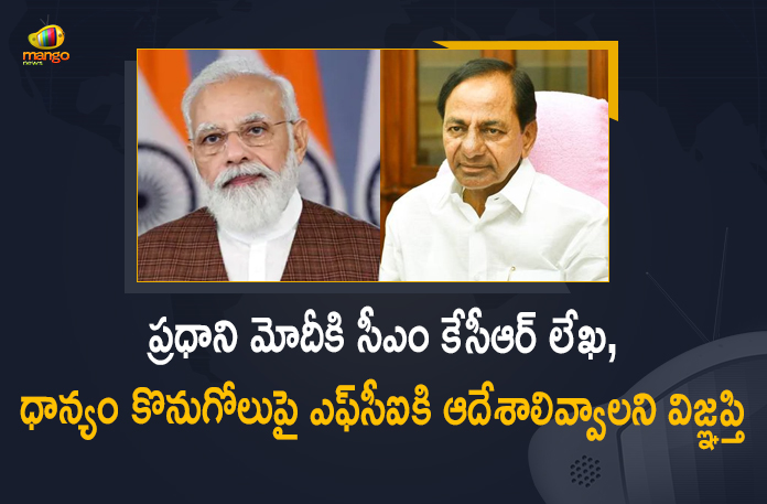 ప్రధాని నరేంద్ర మోదీకి తెలంగాణ రాష్ట్ర ముఖ్యమంత్రి కె.చంద్రశేఖర్ రావు బుధవారం నాడు లేఖ రాశారు. తెలంగాణలో ధాన్యం కొనుగోలుపై ఎఫ్సీఐకి ఆదేశాలివ్వాలని లేఖలో కోరారు. “తెలంగాణ రాష్ట్రం ఏర్పడిన 2014 నుంచి, వ్యవసాయరంగంలో తెలంగాణ అద్భుతమైన అభివృద్ధిని సాధించింది అనేది మీకు తెలిసిన విషయమే. వినూత్న విధానాలతో తెలంగాణ ప్రభుత్వం అమలు పరుస్తున్న వరుస పథకాల మూలంగానే వ్యవసాయ రంగం ధృఢంగా తయారై ఇంతటి అభివృద్ధి సాధ్యమైంది. 24 గంటలపాటు నాణ్యమైన విద్యుత్తును పూర్తి ఉచితంగా అందిస్తూ, ఏడాదికి ఎకరానికి 10,000 రూపాయల పంటపెట్టుబడి ప్రోత్సాహకాన్ని తెలంగాణ రైతుకు రాష్ట్ర ప్రభుత్వం అందిస్తున్నది. కష్టజీవి అయిన తెలంగాణ రైతు, రాష్ట్ర ప్రభుత్వం అందిస్తున్న ప్రోత్సాహకాలను అందిపుచ్చుకుంటూ గుణాత్మకంగా దిగుబడిని సాధిస్తున్నాడు. తద్వారా దేశ ప్రగతికి దోహదం చేస్తున్నాడు. తెలంగాణ రాష్ట్ర ఏర్పాటుకు ముందు, ఎక్కడ చూసినా తెలంగాణలో కరువు కాటకమే తాండవించేంది. నేడు రాష్ట్రంలో గణనీయంగా పెరిగిన సాగునీటి లభ్యత ద్వారా, తెలంగాణ తన అవసరాలను దాటుకుని ఆహార ధాన్యం దిగుబడిలో మిగులు రాష్ట్రంగా నిలిచింది. తెలంగాణ రైతు నేడు దేశానికే అన్నపూర్ణగా ఎదిగిన ప్రగతి ప్రస్థానం గురించి మీకు తెలియనిది కాదు” అని లేఖలో పేర్కొన్నారు.