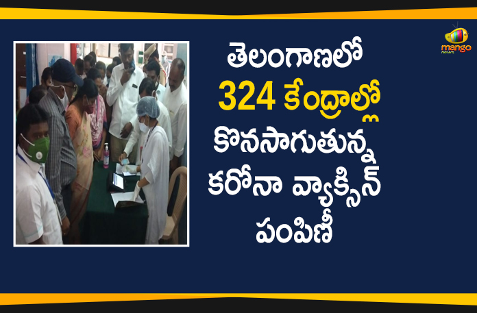 తెలంగాణ రాష్ట్రంలో కరోనా వ్యాక్సిన్ పంపిణీ కొనసాగుతుంది. కరోనా వ్యాక్సినేషన్ ప్రారంభమైన శనివారం నాడు రాష్ట్రవ్యాప్తంగా 140 కేంద్రాల్లో 3962 మందికి వ్యాక్సిన్ వేశారు. తాజాగా మరో 184 కేంద్రాలు పెంచి మొత్తం 324 కేంద్రాల్లో కరోనా వ్యాక్సిన్ పంపిణీ కార్యక్రమం కొనసాగిస్తున్నారు. ముందుగా వారం మొత్తంలో సోమ, మంగళ, గురు, శుక్రవారాల్లో మాత్రమే వ్యాక్సినేషన్ కార్యక్రమం చేపట్టనున్నట్టు అధికారులు వెల్లడించారు. దీంతో సోమవారం నాడు వ్యాక్సినేషన్ కార్యక్రమం తిరిగి ప్రారంభమైంది. ఒక్కో కేంద్రంలో 50 మంది చొప్పున సోమవారం నాడు మొత్తం 16200 మందికి వ్యాక్సిన్ వేయనున్నట్టు వైద్య ఆరోగ్యశాఖ అధికారులు వెల్లడించారు. అత్యధికంగా గ్రేటర్ హైదరాబాద్ పరిధిలో 42 కేంద్రాలు ఏర్పాటు చేశారు.