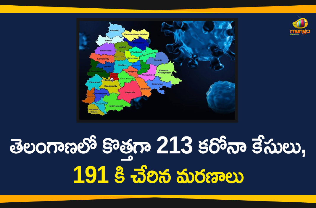 తెలంగాణ రాష్ట్రంలో కొత్తగా 213 కరోనా పాజిటివ్ కేసులు నమోదయ్యాయి. కొత్తగా నమోదైన 213 కేసులతో కలిపి జూన్ 16, మంగళవారం నాటికీ రాష్ట్రంలో మొత్తం కరోనా పాజిటివ్ కేసుల సంఖ్య 5406 కి చేరినట్టు రాష్ట్ర వైద్య ఆరోగ్యశాఖ బులెటిన్ విడుదల చేసింది. మంగళవారం నాడు మొత్తం 1,251 మందిని పరీక్షించినట్టు తెలిపారు. అలాగే కరోనా వలన మరో నలుగురు మరణించడంతో రాష్ట్రంలో ఇప్పటివరకు మరణించిన వారి సంఖ్య 191 కి పెరిగినట్టు తెలిపారు.