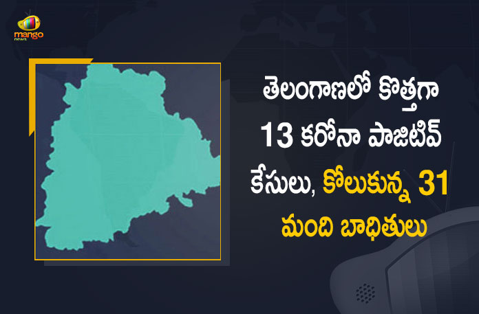 తెలంగాణ రాష్ట్రంలో రోజువారీ కరోనా పాజిటివ్ కేసులు నమోదు తగ్గుముఖం పట్టింది. కొత్తగా 13 మందికి కరోనా పాజిటివ్ గా నిర్ధారణ కావడంతో ఏప్రిల్ 10, ఆదివారం సాయంత్రం 5.30 గంటలవరకు మొత్తం కేసుల సంఖ్య 7,91,498కి చేరింది. కరోనా వలన కొత్తగా ఎలాంటి మరణాలు నమోదు కాలేదు, దీంతో మొత్తం కరోనా మరణాల సంఖ్య 4,111 గా ఉంది. అలాగే మరో 31 మంది కోలుకోగా, ఇప్పటివరకు రికవరీ అయినవారి సంఖ్య 7,87,173కు చేరుకుంది. తాజాగా నమోదైన కరోనా పాజిటివ్ కేసుల్లో హైదరాబాద్ పరిధిలో 10 , నల్గొండలో 1, కరీంనగర్ లో 1, హనుమకొండలో 1 నమోదయ్యాయి.