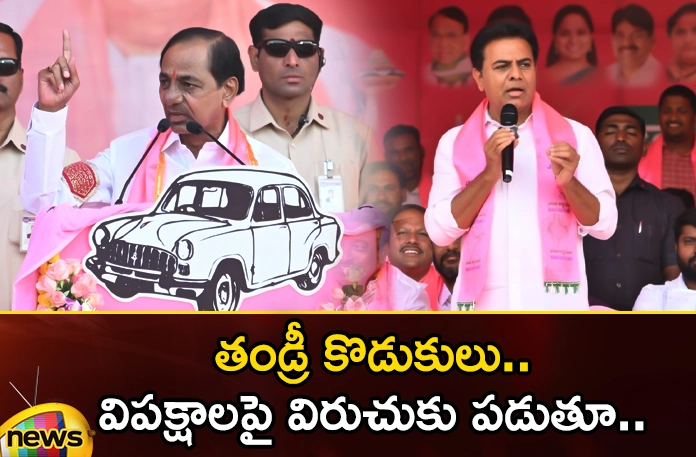 భాషలో యాస.. మాటల్లో పంచ్లు.. పదునైన వాక్కులు.. ప్రజల మనసు లోతుకు వెళ్లేలా సెంట్మెంట్ సూత్రాలు.. ఇవీ తెలంగాణ ఎన్నికల సమరంలో ముఖ్యమంత్రి కే.చంద్రశేఖరరావు, ఆయన తనయుడు, బీఆర్ ఎస్ వర్కింగ్ ప్రెసిడెంట్ తారక రామారావు ఎన్నికల ప్రచారంలో అవలంభిస్తున్న పంథా. తండ్రీతనయులు ఇద్దరూ రాష్ట్రాన్ని చెరోవైపు చుట్టేస్తున్నారు. తూటాల్లాంటి మాటలతో విపక్షాల తీరును ఎండగడుతున్నారు. ఆగమయ్యే తెలంగాణ కావాలా.. బంగారమయ్యే తెలంగాణ కావాలా.. అంటూ కేసీఆర్ ప్రశ్నిస్తుంటే.. సముజ్జీలతో పోటీ.. రాజకీయ మరగుజ్జుగాళ్లతో కాదు.. అంటూ ప్రాసలతో కేటీఆర్ ఆకట్టుకుంటున్నారు. కేసీఆర్ ముందట వీళ్లు రాజకీయ మరగుజ్జులు, పిగ్మీలు. వీళ్లు పెద్ద సిపాయిలట.. వీళ్లు రాష్ట్రాన్ని నడుపుతారట.. మనం చూడల్నాట అని తండ్రిని శిఖరానికి ఎత్తుతూ.. ప్రతిపక్షాలపై మండిపడుతూ తండ్రికి మించిన తనయుడు అనిపించుకుంటున్నారు.
