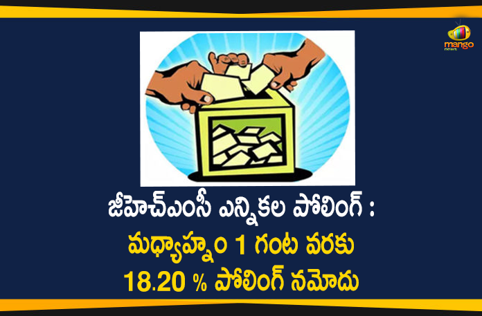 జీహెచ్ఎంసీ ఎన్నికల పోలింగ్ అక్కడక్కడా స్వల్ప ఘటనలు మినహా ప్రశాంతంగా కొనసాగుతుంది. ఉదయం నుంచి కొద్దిగా మందకొడిగా సాగిన పోలింగ్ క్రమంగా ఊపందుకుంటుంది. ఈ నేపథ్యంలో మధ్యాహ్నం 1 గంట వరకు 18.20 % పోలింగ్ నమోదైనట్లు ఎన్నికల అధికారులు వెల్లడించారు. అన్ని పోలింగ్ కేంద్రాల వద్ద కరోనా నిబంధనలకు అనుగుణంగా ప్రజలు ఓటుహాక్కును వినియోగించుకుంటున్నారు. ముఖ్యంగా బస్తీల్లో ప్రజలు పోలింగ్ లో చురుకుగా పాల్గొంటునట్టు తెలుస్తుంది.