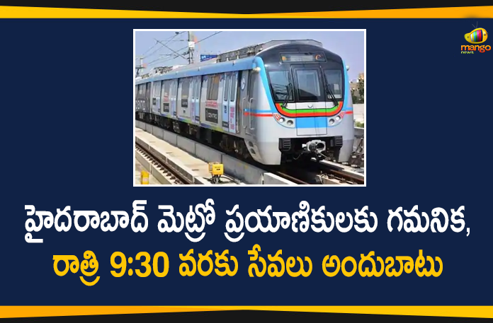 నేటి నుంచి రాత్రి 9:30 గంటలవరకు హైదరాబాద్ మెట్రో రైల్ సేవలు