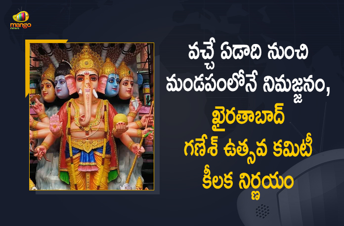 ప్రతి సంవత్సరం వినాయక చవితి పండుగ ఉత్సవాల్లో భాగంగా హైదరాబాద్ నగరంలోని ఖైరతాబాద్ లో ప్రతిష్టించే మహాగణపతి విగ్రహానికి దేశవ్యాప్తంగా ఎంతో ప్రాముఖ్యత ఉన్న సంగతి తెలిసిందే. ఖైరతాబాద్ లో మహాగణపతి దర్శనం కోసం భక్తులు లక్షల సంఖ్యలో వస్తుంటారు, అలాగే నిమజ్జన శోభాయాత్ర కార్యక్రమాన్ని కూడా ఘనంగా నిర్వహిస్తారు. కాగా ఇకపై విగ్రహ ఏర్పాటు, నిమజ్జనంపై ఖైరతాబాద్ గణేశ్ ఉత్సవ కమిటీ కీలక నిర్ణయం తీసుకుంది. వచ్చే ఏడాది నుంచి మట్టి వినాయక విగ్రహం ఏర్పాటు చేయాలని కమిటీ నిర్ణయించింది. మండపంలో 70 అడుగుల ఎత్తయిన మట్టి విగ్రహాన్ని ఏర్పాటు చేయనున్నట్టు తెలిపారు.