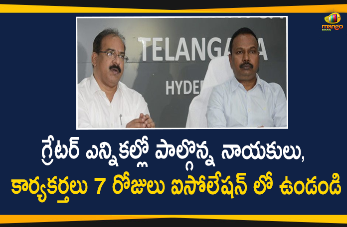 Leaders, Party Activists Who Involved In GHMC Campaign Advised To Self-Isolate For One Week,GHMC Voters,Party Activists Isolate For A Week,GHMC Campaign,Party Activists,GHMC Campaign Advised To Self-Isolate For One Week,Leaders And Party Activists To Self-Isolate For One Week,Isolate,All Involved In GHMC Campaign Advised To Self-Isolate,Hyderabad,All Involved In GHMC Polls To Self-Isolate For One Week,Mango News,Mango News Telugu,GHMC Elections 2020,GHMC,GHMC Elections,GHMC Voters Isolate For A Week,All Involved In GHMC Campaign Advised To Self-Isolate