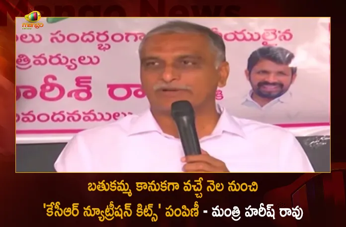 ఇక తెలంగాణలో గర్భిణీలకు ‘కేసీఆర్ న్యూట్రీషన్ కిట్స్’ అందించటానికి ఏర్పాట్లు చేతున్నామని తెలిపిన మంత్రి, బతుకమ్మ కానుకగా వచ్చే నెల నుంచి వాటిని పంపిణీ చేయనున్నట్లు ప్రకటించారు. దీనిలో భాగంగా ముందుగా ఎనీమియా ప్రభావం ఎక్కువగా ఉన్న 9 జిల్లాల్లో ప్రారంభించనున్నట్లు పేర్కొన్నారు. ఈ మేరకు ములుగు, కామారెడ్డి, ఆదిలాబాద్, భద్రాద్రి కొత్తగూడెం, జయశంకర్ భూపాలపల్లి, వికారాబాద్, జోగులాంబ గద్వాల్, కుమ్రంభీం ఆసిఫాబాద్, నాగర్ కర్నూల్ జిల్లాలలో ఈ కిట్స్ పంపిణీ చేస్తామని వెల్లడించారు. సీఎం కేసీఆర్ సూచనల ప్రకారం ఈ కిట్లు అందిస్తున్నామని తెలిపిన హరీష్ రావు, దీనిద్వారా సుమారు 1.50 లక్షల మంది గర్భిణులకు ప్రయోజనం కలుగుతుందని తెలిపారు. రూ.2 వేలు విలువ చేసే ఈ కిట్లో న్యూట్రీషన్ మిక్స్ పౌడర్ కిలో బాటిల్స్ 2, ఒక కిలో ఖర్జూర, ఐరన్ సిరప్ బాటిల్స్ 3, అర కేజీ నెయ్యి ఉంటాయని వివరించారు. అలాగే డెలివరీ సమయం లోపు రెండు సార్లు ఈ కిట్ను అందిస్తామని మంత్రి హరీష్ రావు చెప్పారు.