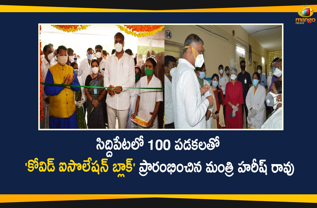 సిద్దిపేట పట్టణంలోని ఏరియా ఆసుపత్రిలో కోవిడ్ బాధితులకు వైద్య సేవలు అందించేందుకు 100 పడకలతో సిద్ధం చేసిన ప్రత్యేక కోవిడ్ ఐసొలేషన్ బ్లాక్ ను జూలై 15, బుధవారం నాడు రాష్ట్ర ఆర్ధిక శాఖ మంత్రి హరీష్ రావు ప్రారంభించారు. అనంతరం ఈ కోవిడ్ ఐసొలేషన్ బ్లాక్ లో ఏర్పాటు చేసిన సౌకర్యాలను మంత్రి పరిశీలించారు. ఈ సందర్భంగా వైద్యులు, స్టాఫ్ నర్స్ లు, పారిశుధ్య సిబ్బందికి పలు అంశాలపై సూచనలు చేశారు. ఈ బ్లాక్ లో పని చేసే స్టాఫ్ నర్స్ లకు 500 ఫేస్ ప్రొటెక్షన్ మాస్క్ లు అందిస్తామని చెప్పారు. కరోనా బాధితుల సంఖ్యకు అనుగుణంగా సరిపడినంతగా వైద్యులు, స్టాఫ్ నర్స్ లను పెంచుతామని అన్నారు. కరోనా బాధితులకు అందించే ఆహారం, ఇతర అంశాల ఏర్పాట్ల గురించి వైద్యాధికారులను అడిగి తెలుసుకున్నారు.