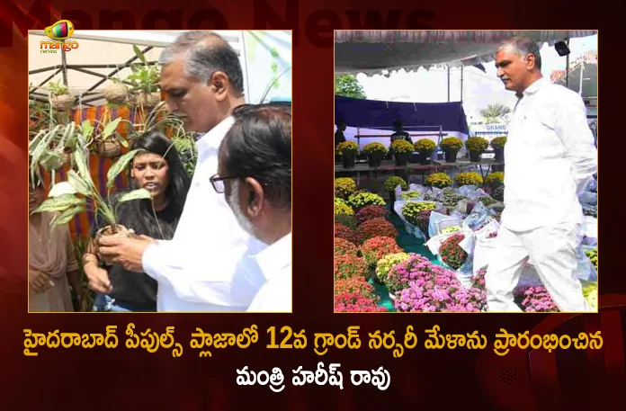 హైదరాబాద్ నెక్లెస్ రోడ్ లోని పీపుల్స్ ప్లాజాలో గురువారం 12వ గ్రాండ్ నర్సరీ మేళాను రాష్ట్ర వైద్యారోగ్య, ఆర్థిక శాఖల మంత్రి హరీష్ రావు ప్రారంభించారు. నేటి నుంచి ఐదు రోజుల పాటు, ఈనెల 22 వరకు ఈ గ్రాండ్ నర్సరీ మేళా జరగనుంది. అనంతరం అక్కడ ఏర్పాటు చేసిన స్టాళ్లను మంత్రి పరిశీలించారు. స్టాళ్లలో ఉన్న పలు రకాల మొక్కలు గురించి ఆయన అడిగి తెలుసుకున్నారు. ఇక ఈ సందర్భంగా మంత్రి హరీష్ రావు మాట్లాడుతూ.. నర్సరీ మేళా ప్రారంభించుకోవడం సంతోషంగా ఉందని, తెలంగాణ ప్రభుత్వం కూడా చెట్ల పెంపకాన్ని ప్రతిష్టాత్మకంగా తీసుకుని రాష్ట్రంలో పచ్చదనాన్ని పెంచడానికి కృషి చేస్తోందని తెలిపారు. దీనిలో భాగంగా రాష్ట్రవ్యాప్తంగా గ్రామాల్లో హరితహారంతో మొక్కలు పెంచడం, పల్లె ప్రకృతి వనాలు వంటి కార్యక్రమాలు చేపట్టినట్లు మంత్రి వెల్లడించారు.