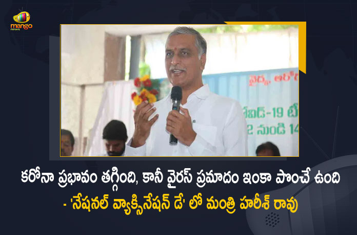 కరోనా ప్రభావం తగ్గింది, కానీ వైరస్ ప్రమాదం ఇంకా పొంచే ఉందని తెలంగాణ రాష్ట్ర వైద్యారోగ్య శాఖ మంత్రి హరీష్ రావు స్పష్టం చేశారు. ప్రతి ఒక్కరూ వ్యాక్సిన్ తీసుకోవాలని, ఈ విషయంలో ప్రజలందరూ ప్రభుత్వానికి సహకరించాలని హరీష్ రావు విజ్ఞప్తి చేశారు. బుధవారం ఖైరతాబాద్ నియోజకవర్గ పరిధిలోని వెల్నెస్ సెంటర్లో వ్యాక్సినేషన్ కార్యక్రమాన్ని మరియు 50 పడకల సీహెచ్సీ ఆస్పత్రిని మంత్రి ప్రారంభించారు. ఈ సందర్భంగా ఆయన మాట్లాడుతూ.. ‘నేషనల్ వ్యాక్సినేషన్ డే’ సందర్భంగా 12 నుంచి 14 ఏళ్ల లోపు పిల్లలకు వ్యాక్సినేషన్ అందించడం సంతోషంగా ఉందని అన్నారు. కరోనా ప్రభావం తగ్గింది తప్ప వైరస్ ప్రమాదం ఇంకా పొంచే ఉందన్నారు. దీనికి నిదర్శనమే చైనా, అమెరికా, హాంకాంగ్లో కొత్త కరోనా కేసులు నమోదు కావడం అని తెలిపారు. కరోనా కేసులపై ప్రపంచ ఆరోగ్య సంస్థ కూడా హెచ్చరిస్తోందని చెప్పారు.