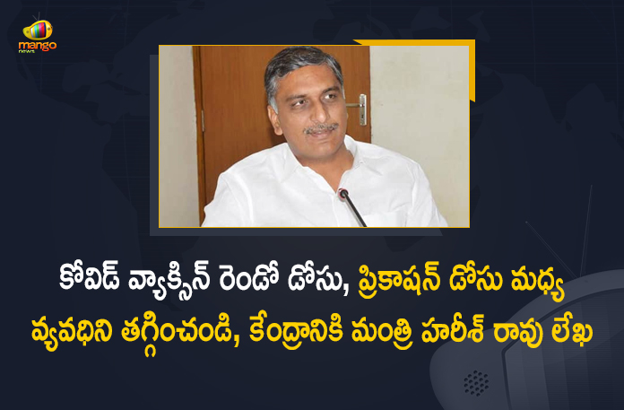 కేంద్ర ఆరోగ్య శాఖ మార్గదర్శకాలకు అనుగుణంగా జనవరి 10వ తేదీ నుంచి తెలంగాణలో హెల్త్కేర్, ఫ్రంట్లైన్ వర్కర్స్ కు మరియు 60 ఏళ్లు వయసుపైబడి కోమార్బిడిటీస్ (సహ-అనారోగ్యాలు) ఉన్నవారికీ ప్రికాషన్ డోస్ (కోవిడ్ వ్యాక్సిన్) అందిస్తున్న సంగతి తెలిసిందే. ఈ నేపథ్యంలో ప్రికాషన్ డోసుకు సంబంధించి కేంద్ర ఆరోగ్య శాఖ మంత్రి మనసుఖ్ మాండవీయాకు తెలంగాణ వైద్య ఆరోగ్య శాఖ మంత్రి హరీశ్ రావు మంగళవారం లేఖ రాశారు. కోవిడ్ వ్యాక్సిన్ రెండో డోసు మరియు ప్రికాషన్ డోసు మధ్య వ్యవధిని 9 నెలల నుంచి 6 నెలలకు తగ్గించాలని లేఖలో కోరారు.