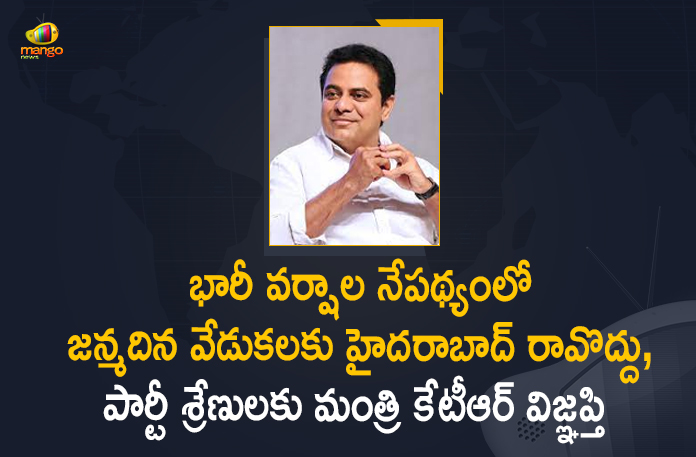 రాష్ట్రంలో కురుస్తున్న భారీ వర్షాల నేపథ్యంలో తన జన్మదిన వేడుకలకు ఎవరు హైదరాబాద్ రావద్దని పార్టీ శ్రేణులకు, అభిమానులకు టీఆర్ఎస్ వర్కింగ్ ప్రెసిడెంట్, రాష్ట్ర ఐటీ, పరిశ్రమలు, మున్సిపల్ శాఖ మంత్రి కేటీఆర్ విజ్ఞప్తి చేశారు. ఈ మేరకు మంత్రి కేటీఆర్ కార్యాలయం ఒక ప్రకటన విడుదల చేసింది. మరో రెండు మూడు రోజులపాటు విస్తారంగా వర్షాలు కురిసే అవకాశం ఉన్న నేపథ్యంలో ప్రజాప్రతినిధులంతా క్షేత్రస్థాయిలోనే ప్రజలకు అందుబాటులో ఉండాలని, అవసరమైన చోట సహాయక చర్యల్లో పాల్గొనాలని సీఎం కేసీఆర్ ఆదేశాల ఇచ్చిన నేపథ్యంలో, పార్టీ శ్రేణులంతా ఈ సహాయక కార్యక్రమాల్లో పాల్గొనాలని కోరుతున్నానని మంత్రి కేటీఆర్ పేర్కొన్నారు .