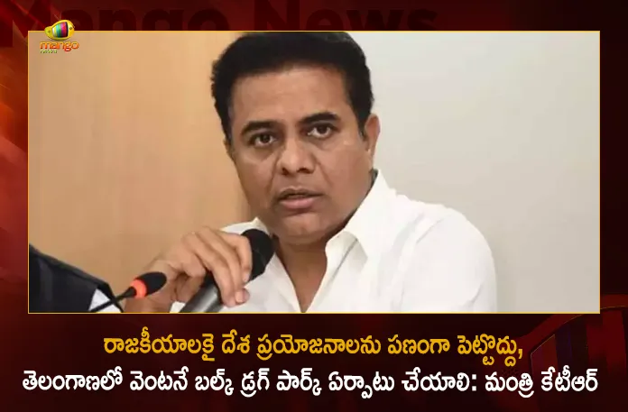 బల్క్ డ్రగ్ పార్కుల కేటాయింపులో తెలంగాణ రాష్ట్రానికి జరిగిన తీవ్ర అన్యాయం జరిగిందంటూ కేంద్ర కెమికల్, ఫెర్టిలైజర్ శాఖ మంత్రి మనసుఖ్ మాండవియాకి తెలంగాణ రాష్ట్ర పరిశ్రమల శాఖ మంత్రి కేటీఆర్ లేఖ రాశారు. తెలంగాణ పట్ల కేంద్ర సర్కార్ వివక్షపూరిత వైఖరి కొనసాగుతూనే ఉందని మంత్రి కేటీఆర్ అన్నారు. తాజాగా కేంద్ర ప్రభుత్వం ప్రకటించిన బల్క్ డ్రగ్ పార్క్ పథకంలో తెలంగాణకు చోటు దక్కకపోవడమే ఇందుకు సాక్ష్యం అన్నారు. లైఫ్ సైన్సెస్- ఫార్మా రంగాల్లో అంతర్జాతీయ స్థాయిలో దూసుకుపోతున్న దేశ లైఫ్ సైన్సెస్ రాజధాని, వ్యాక్సిన్ క్యాపిటల్ ఆఫ్ వరల్డ్ హైదరాబాద్ నగరాన్ని కావాలనే విస్మరించిందని మంత్రి కేటీఆర్ అసంతృప్తి వ్యక్తం చేశారు. బల్క్ డ్రగ్ పరిశ్రమ ఏర్పాటుకు ఆంధ్రప్రదేశ్, హిమాచల్ ప్రదేశ్, గుజరాత్ రాష్ట్రాలను ఎంపిక చేయడం మోదీ సర్కార్ వివక్షాపూరిత రాజకీయాలకు పరాకాష్ట అన్నారు. అంతర్జాతీయ ప్రమాణాలతో రాష్ట్ర ప్రభుత్వం నెలకొల్పుతున్న హైదరాబాద్ ఫార్మాసిటీ పేరును కనీసం పరిశీలించకుండా తెలంగాణ పట్ల తనకున్న వివక్షను కేంద్ర సర్కార్ బయటపెట్టుకుందని కేటీఆర్ విమర్శించారు.