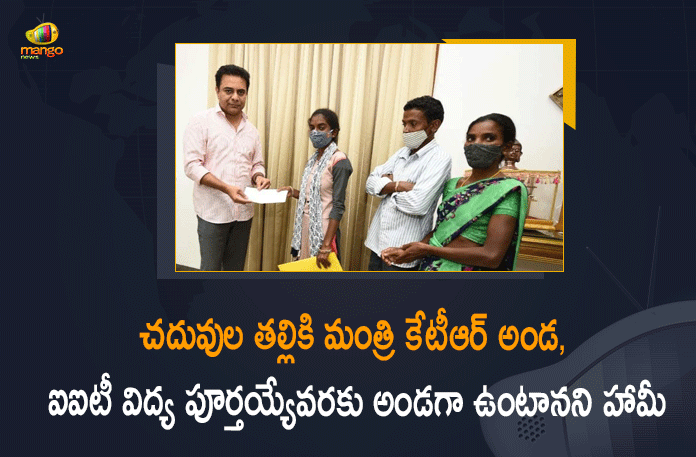 తెలంగాణ రాష్ట్ర ఐటీ, పరిశ్రమలు, మున్సిపల్ శాఖ మంత్రి కేటీఆర్ మరోసారి తన గోప్ప మనసును చాటుకున్నారు. ఐఐటీలో సీటు సాధించి, ఫీజు చెల్లించడానికి డబ్బులేక ఇబ్బంది పడుతున్న ఓ యువతికి తన సొంత నిధులతో ఐఐటీ విద్య పూర్తయ్యేవరకు అండగా ఉంటానని హామీ ఇచ్చారు. నిరుపేద కోయ తెగకు చెందిన గిరిజన విద్యార్థిని కారం శ్రీలత ప్రతిష్టాత్మక ఐఐటీలో స్థానం సంపాదించుకుంది. భద్రాద్రి కొత్తగూడెం జిల్లా చర్ల మండలం మామిడిగూడెంకు చెందిన శ్రీలత చిన్ననాటి నుంచి చదువులో అద్భుతమైన ప్రతిభను ప్రదర్శిస్తూ వస్తుంది. తన నిరుపేద పరిస్థితులను దాటుకుని ఇంటర్మీడియట్లో 97 శాతం మార్కులను సాధించింది. నాగర్ కర్నూల్ లోని తెలంగాణ ట్రైబల్ వెల్ఫేర్ రెసిడెన్షియల్ జూనియర్ కళాశాలలో చదివి ఐఐటీ-జేఈఈ పరీక్ష ద్వారా ఐఐటి వారణాసిలో ఇంజనీరింగ్ సీట్ సంపాదించింది. అయితే వ్యవసాయ కూలీలుగా పనిచేసే తల్లిదండ్రులు ఆమె ఫీజులు చెల్లించే పరిస్థితిలో లేరు. ఇప్పటిదాకా పూర్తిస్థాయి ప్రభుత్వ విద్యను అభ్యసించిన శ్రీలతకి ఐఐటి ఫీజులు చెల్లించేందుకు మార్గం లేక తన ఉన్నత విద్య స్వప్నం చెదిరి పోతుందేమోనని ఇబ్బందులు పడుతున్న శ్రీలత పరిస్థితి మంత్రి కేటీఆర్ దృష్టికి వచ్చింది. వెంటనే స్పందించిన మంత్రి కేటీఆర్ ఆయన తన సొంత నిధులతో శ్రీలత ఐఐటీ విద్య పూర్తయ్యేవరకు అండగా ఉంటానని హామీ ఇచ్చారు. ఈ మేరకు ప్రగతి భవన్ లో శ్రీలతను అభినందించారు. ఆమె విద్యాభ్యాసం పూర్తయ్యే వరకు తాను బాధ్యత తీసుకుంటున్నట్లు ఆమె కుటుంబ సభ్యులకు భరోసా ఇచ్చారు.