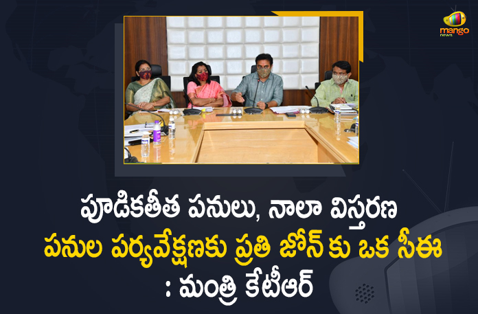 గ్రేటర్ హైదరాబాద్ లో నాలా పూడికతీత పనులు, నాలా విస్తరణ, ఆక్రమణల తొలగింపు పనులను మరింత ముమ్మరంగా చేసేందుకుగాను ప్రతీ జోన్ కి ప్రత్యేకంగా ఒక చీఫ్ ఇంజనీర్ ను పర్యవేక్షక అధికారిగా నియమిస్తున్నట్టు రాష్ట్ర మున్సిపల్ శాఖ మంత్రి కేటీ రామారావు తెలిపారు. జీహెచ్ఎంసి ప్రధాన కార్యాలయంలో గ్రేటర్ హైదరాబాద్ అభివృద్ధి కార్యక్రమాలపై మున్సిపల్ శాఖ మంత్రి కేటీఆర్ సోమవారం నాడు సమీక్ష నిర్వహించారు. ప్రధానంగా నగరంలో శానిటేషన్, రహదారుల అభివృద్ధి, నాలా విస్తరణ కార్యక్రమాలపై నిర్వహించిన ఈ సమావేశానికి నగర మేయర్ గద్వాల్ విజయలక్ష్మి, ఉప మేయర్ మోతె శ్రీలతా శోభన్ రెడ్డి, మున్సిపల్ శాఖ ముఖ్య కార్యదర్శి అర్వింద్ కుమార్, జీహెచ్ఎంసి కమీషనర్ లోకేశ్ కుమార్, జీహెచ్ఎంసీ , జలమండలి తదితర విభాగాల ఉన్నతాధికారులు హాజరయ్యారు.