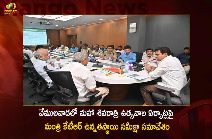 వేములవాడలో మహా శివరాత్రి ఉత్సవాల ఏర్పాట్లపై రాష్ట్ర ఐటీ, పరిశ్రమలు, మున్సిపల్ శాఖ మంత్రి కేటీఆర్ ఉన్నతస్థాయి సమీక్షా సమావేశం నిర్వహించారు. మంగళవారం హైదరాబాద్ లో జరిగిన ఈ సమీక్షా సమావేశంలో వేములవాడ ఎమ్మెల్యే చెన్నమనేని రమేష్బాబు, సంబంధిత అధికారులు పాల్గొన్నారు. ఈ సందర్భంగా వేములవాడ ఆలయ అభివృద్ధి, అలాగే వేములవాడ పట్టణంలో జరుగుతున్న అభివృద్ధి పనుల స్థితిగతులపై కూడా మంత్రి కేటీఆర్ సమీక్షించారు. వేములవాడలో జాతరకు అదనపు నిధులు కేటాయిస్తున్నట్లు మంత్రి ప్రకటించి, తగిన చర్యలు తీసుకోవాలని అధికారులను ఆదేశించారు. అలాగే పట్టణంలో భద్రత, పారిశుధ్యం మరియు అవసరమైన సౌకర్యాలపై దృష్టి పెట్టాలన్నారు. వార్షిక సాంస్కృతిక కార్యక్రమాలు పెద్ద ఎత్తున నిర్వహించేలా రాష్ట్ర సాంస్కృతిక శాఖతో సమన్వయం చేసుకోవాలని సూచించారు.