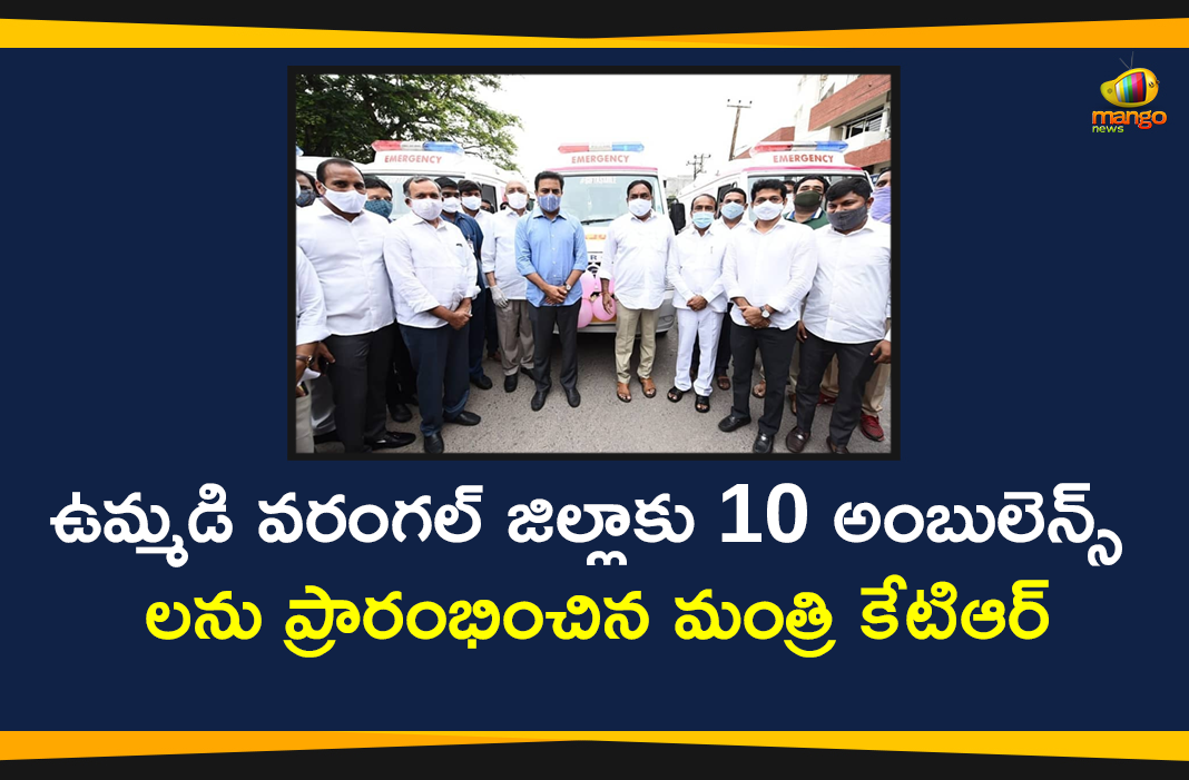 కరోనా బాధితులకు అత్యంత అనుకూలంగా, అందుబాటులో ఉండే విధంగా అంబులెన్స్ వాహనాలను తీర్చిదిద్దామని, ఈ వాహనాలు కరోనా బాధితులకు ఎంతో ఉపయోగంగా ఉంటాయని రాష్ట్ర ఐటీ, పరిశ్రమలు, పురపాలక, పట్టణాభివృద్ధి శాఖ మంత్రి కల్వకుంట్ల రామారావు అన్నారు. గిఫ్ట్ ఏ స్మైల్ పిలుపులో భాగంగా, వరంగల్ ఉమ్మడి జిల్లా నుంచి మొత్తం 14 అంబులెన్స్ వాహనాలకు పలువురు దాతలు విరాళాలు ఇవ్వగా, ఉమ్మడి జిల్లాలోని ఎమ్మెల్యేలు రాష్ట్ర పంచాయతీరాజ్, గ్రామీణాభివృద్ధి, గ్రామీణ మంచినీటి సరఫరాశాఖ మంత్రి ఎర్రబెల్లి దయాకర్ రావు నేతృత్వంలో మంత్రి కేటిఆర్ కి అందచేశారు. ఆ నిధులతో ప్రస్తుతం బుధవారం 10వాహనాలను సిద్ధం చేశారు. ఆ 10 అంబులెన్స్ వాహనాలను మంత్రి కేటిఆర్ ప్రగతి భవన్ లో విడుదల చేశారు. ఈ కార్యక్రమానికి రాష్ట్ర మంత్రులు ఎర్రబెల్లి దయాకర్ రావు, ఈటల రాజేందర్, చేవెళ్ళ ఎంపీ డాక్టర్ గడ్డం రంజిత్ రెడ్డి, ఎమ్మెల్సీ పోచంపల్లి శ్రీనివాస్ రెడ్డి, ఎమ్మెల్యేలు గండ్ర వెంకట రమణారెడ్డి, మాజీ ఎమ్మెల్యే డాక్టర్ సుధాకర్ రావు, తదితరులు పాల్గొన్నారు.