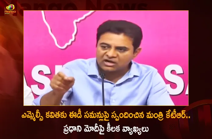 ఢిల్లీ మద్యం కుంభకోణం కేసులో బీఆర్ఎస్ ఎమ్మెల్సీ కల్వకుంట్ల కవితకు ఎన్ఫోర్స్మెంట్ డైరెక్టరేట్ (ఈడీ) సమన్లు పంపడంపై ఆమె సోదరుడు, తెలంగాణ మంత్రి కేటీఆర్ స్పందించారు. గురువారం దీనిపై ఆయన తెలంగాణ భవన్లో మంత్రులతో కలిసి ప్రెస్మీట్ నిర్వహించారు. ఈ క్రమంలో ప్రధాని మోదీ మరియు కేంద్రంలోని బీజేపీ ప్రభుత్వంపై సంచలన వ్యాఖ్యలు చేశారు. ఈ సందర్భంగా మంత్రి కేటీఆర్ మాట్లాడుతూ.. ఎమ్మెల్సీ కవితకు వచ్చింది ఈడీ సమన్లు కాదు, మోదీ సమన్లని అభివర్ణించారు. తమకు సంబంధం లేని కేసులో ఏదో జరుగుతోందని ప్రజలను తప్పుదారి పట్టిస్తున్నారని మండిపడ్డారు. ప్రధాని మోదీ చేతుల్లో ఈడీ కీలుబొమ్మగా, సీబీఐ తోలుబొమ్మగా మారిందని మంత్రి తీవ్ర ఆరోపణలు చేశారు.