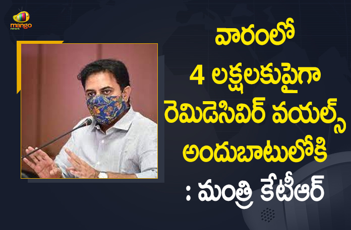 తెలంగాణ రాష్ట్రంలో వారంలోపు అన్ని ప్రభుత్వ ఆసుపత్రులలో 4 లక్షలకుపైగా రెమిడెసివిర్ వయల్స్ అందుబాటులోకి ఉండేలా ఏర్పాట్లు చేసినట్టు తెలంగాణ రాష్ట్ర ఐటీ, మున్సిపల్, పరిశ్రమల శాఖ మంత్రి కేటీఆర్ వెల్లడించారు. ముఖ్యమంత్రి కె.చంద్రశేఖర్ రావు ఆదేశాల మేరకు బుధవారం నాడు రెమిడెసివిర్ ఇంజెక్షన్స్ కు సంబంధించి పలువురు తయారీదారులతో చర్చలు జరిపినట్టు తెలిపారు. వారంలోగా 4 లక్షలకుపైగా రెమిడెసివిర్ వయల్స్ అందుబాటులోకి వస్తాయన్నారు. కరోనా చికిత్సలో భాగంగా ఎమెర్జెన్సీ కేసులలో రెమిడెసివిర్ ఇంజక్షన్లు ఇస్తున్న సంగతి తెలిసిందే. ఇటీవల రాష్ట్రంలో కరోనా కేసులు పెరుగుతున్న నేపథ్యంలో రెమిడెసివిర్ ఇంజక్షన్ల వినియోగం కూడా పెరిగింది. ఈ క్రమంలోనే రాష్ట్రంలో రెమిడెసివిర్ కొరత లేకుండా పూర్తిస్థాయిలో అందుబాటులో ఉండేలా తెలంగాణ ప్రభుత్వం చర్యలు చేపడుతుంది.