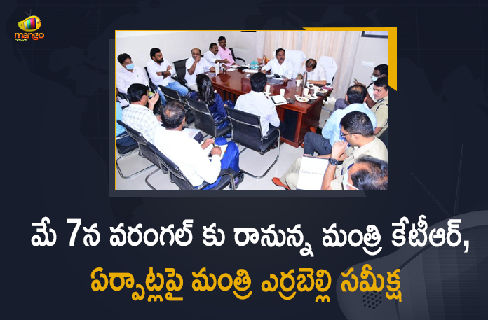 మే 7వ తేదీన తెలంగాణ రాష్ట్ర ఐటీ, పురపాలక, పట్టణాభివృద్ధి శాఖల మంత్రి కేటీ రామారావు వరంగల్ పర్యటనకు రానున్నారు. మంత్రి కేటీఆర్ పర్యటన ఖరారు, ఏర్పాట్లపై రాష్ట్ర పంచాయతీరాజ్ గ్రామీణాభివృద్ధి గ్రామీణ మంచి నీటి సరఫరా శాఖల మంత్రి ఎర్రబెల్లి దయాకర్ రావు, ప్రభుత్వ చీఫ్ విప్ దాస్యం వినయ్ భాస్కర్, ఎమ్మెల్యేలు చల్లా ధర్మా రెడ్డి, అరూరి రమేశ్, కుడా చైర్మన్ సుందర్ రాజు, వరంగల్, హనుమకొండ జిల్లాల కలెక్టర్లు, వరంగల్ మహానగర కమిషనర్, సీపీ, ఇతర అధికారులతో సమావేశమై చర్చించారు.
