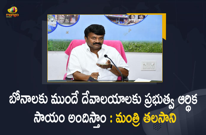 తెలంగాణ సంస్కృతిని చాటిచెప్పే బోనాల ఉత్సవాలను అత్యంత ఘనంగా నిర్వహించేలా ప్రభుత్వం అన్ని ఏర్పాట్లు చేస్తుందని రాష్ట్ర పశుసంవర్ధక, మత్స్య, పాడి పరిశ్రమల అభివృద్ధి, సినిమాటోగ్రఫీ శాఖల మంత్రి తలసాని శ్రీనివాస్ యాదవ్ చెప్పారు. మంగళవారం మాసాబ్ ట్యాంక్ లోని తన కార్యాలయం నుండి బోనాల ఉత్సవాల ఏర్పాట్ల పై మంత్రి శ్రీనివాస్ యాదవ్ టెలి కాన్ఫరెన్స్ నిర్వహించారు. ఈ సందర్భంగా మంత్రి తలసాని శ్రీనివాస్ మాట్లాడుతూ, తెలంగాణ రాష్ట్రం ఏర్పడిన తర్వాత బోనాల ఉత్సవాలను రాష్ట్ర పండుగగా ప్రకటించి ఎంతో ఘనంగా నిర్వహిస్తున్న విషయాన్ని గుర్తుచేశారు. ఈ సంవత్సరం కూడా బోనాల ఉత్సవాలను అత్యంత ఘనంగా నిర్వహించేందుకు ముఖ్యమంత్రి కె.చంద్రశేఖర్ రావు ఆదేశాల మేరకు ప్రభుత్వం 15 కోట్ల రూపాయలను విడుదల చేసిందని పేర్కొన్నారు. సుమారు 3500కు పైగా ప్రభుత్వ, ప్రైవేట్ దేవాలయాలకు ఆర్ధిక సహాయం చెక్కులను అందిస్తున్నట్లు తెలిపారు. వివిధ దేవాలయాలకు ప్రభుత్వం అందించే ఆర్ధిక సహాయాన్ని బోనాలకు ముందే అందించడం జరుగుతుందని తెలిపారు.