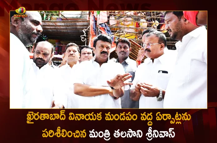 ఆగస్టు 31 నుండి సెప్టెంబరు 9 వ తేదీ వరకు నిర్వహించే గణేష్ ఉత్సవాలకు ప్రభుత్వం అన్ని ఏర్పాట్లను చేస్తుందని రాష్ట్ర పశుసంవర్ధక, మత్స్య, పాడి పరిశ్రమల అభివృద్ధి, సినిమాటోగ్రఫీ శాఖల మంత్రి తలసాని శ్రీనివాస్ యాదవ్ వెల్లడించారు. బుధవారం ఖైరతాబాద్ వినాయక మండపం వద్ద వివిధ శాఖల అధికారులతో కలిసి ఏర్పాట్లు పరిశీలించారు. ఈ సందర్భంగా మంత్రి మాట్లాడుతూ, అన్ని వర్గాల ప్రజలు పండుగలు, వేడుకలను ఘనంగా జరుపుకోవాలనేది ముఖ్యమంత్రి కె.చంద్రశేఖర్ రావు ఆలోచన అని పేర్కొన్నారు. అందులో భాగంగానే ప్రభుత్వం ఆధ్వర్యంలో అన్ని పండుగలను నిర్వహిస్తున్న విషయాన్ని గుర్తు చేశారు. గణేష్ ఉత్సవాల సందర్భంగా భక్తులు, నిర్వహకులు ఎలాంటి ఇబ్బందులకు గురికాకుండా అన్ని రకాల జాగ్రత్తలు తీసుకోవడం జరుగుతుందని చెప్పారు. ఖైరతాబాద్ వినాయకుడు అంటే తెలియని వారు ఉండరని, ఎంతో ప్రసిద్ధి చెందిన ఇక్కడ ప్రతిష్టించే గణనాధుడిని దర్శించుకునేందుకు వివిధ ప్రాంతాల నుండి లక్షలాది మంది వస్తారని అన్నారు. దానిని దృష్టిలో ఉంచుకొని పటిష్టమైన భారీకేడ్ లను ఏర్పాటు చేయడం జరుగుతుందని తెలిపారు.
