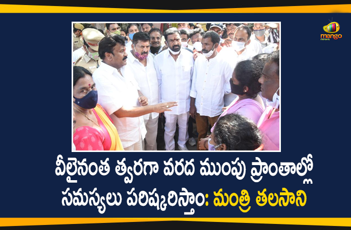 హుస్సేన్ సాగర్ నుండి నాలాలోని నీరు విడుదల చేయడంతో నాలా పొంగి తమ ఇండ్లలోని నీరు చేరిందని అరుంధతి నగర్ కాలనీ వాసులు మంత్రికి వివరించారు. నాలా వెంట రిటైనింగ్ వాల్ ఎత్తు పెంచి నిర్మిస్తే భవిష్యత్ లో ఎలాంటి ఇబ్బందులు ఏర్పడవని తెలపగా, ప్రస్తుతం ఉన్న 3 అడుగుల రిటైనింగ్ వాల్ ను 10 అడుగుల ఎత్తుకు నిర్మించేందుకు తగు చర్యలు చేపడతామని ప్రకటించారు. ఈ సందర్బంగా మంత్రి తలసాని మాట్లాడుతూ ఈ సంవత్సరం అత్యధిక వర్షపాతం నమోదైందని, నాలాలపై, నాలాల వెంట నిర్మాణాలు చేసిన ప్రాంతాలే అత్యధికంగా ముంపుకు గురైనాయని పేర్కొన్నారు. నగరంలో నెలకొన్న పరిస్థితులపై ముఖ్యమంత్రి కల్వకుంట్ల చంద్రశేఖర్ రావు అత్యవసర సమావేశం నిర్వహించి సహాయక చర్యలు చేపట్టాలని, బాధితులకు అండగా ఉండాలని ఆదేశించారని చెప్పారు. ప్రజలు అంటువ్యాధుల బారిన పడకుండా ప్రత్యేక చర్యలు తీసుకోవాలని వైద్య సిబ్బందిని మంత్రి ఆదేశించారు.