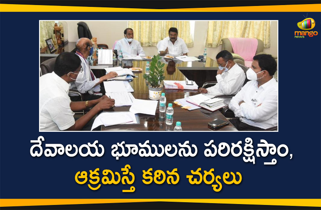 హైదరాబాద్ పరిధిలో రూ.55 కోట్ల వ్యయంతో 13 ప్రాంతాల్లో నిరుపయోగంగా ఉన్న దేవాదాయ భూముల్లో షాపింగ్ కాంప్లెక్స్ లు, కళ్యాణ మండపాల నిర్మాణానికి ప్రణాళికలు రూపొందించామని దేవాదాయ శాఖ కమిషనర్ అనిల్ కుమార్ ఈ సందర్భంగా మంత్రులకు వివరించారు. రాష్ట్ర వ్యాప్తంగా స్పెషల్ డ్రైవ్ ద్వారా 1300 ఎకరాల ఆలయ భూములను గుర్తించి వెనక్కి తీసుకున్నామని, 21 వేల ఎకరాల ఆలయ భూములకు రక్షణ సరిహద్దు బోర్డులు ఏర్పాటు చేశామని తెలిపారు. దీర్ఘ కాలంగా కోర్టుల్లో పెండింగ్ లో ఉన్నదేవాదాయ శాఖ భూములపైన ఉన్న వివాదాలను పరిష్కరించేందుకు కోర్టుల్లో బలమైన వాదనలు వినిపించేందుకు ప్రత్యేక చర్యలు తీసుకోవాలన్నారు. అవసరమైతే లీగల్ ఆఫీసర్లను కూడా నియమించాలని చెప్పారు. పోలీసు శాఖ సమన్వయంతో స్పెషల్ టాస్క్ ఫోర్స్ ను ఏర్పాటు చేసి, భూ ఆక్రమదారులను ఖాళీ చేయించాలని మంత్రులు ఆదేశించారు.