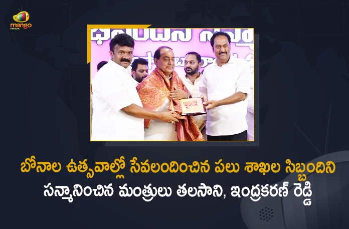 జీహెచ్ఎంసీ పరిధిలో నిర్వహించిన బోనాల ఉత్సవాలలో సేవలందించిన పలు శాఖల సిబ్బందిని రాష్ట్ర పశుసంవర్ధక, మత్స్య, పాడి పరిశ్రమల అభివృద్ధి, సినిమాటోగ్రఫీ శాఖల మంత్రి తలసాని శ్రీనివాస్ యాదవ్, దేవాదాయశాఖ మంత్రి ఇంద్రకరణ్ రెడ్డితో కలిసి ఘనంగా సన్మానించారు. ఈ మేరకు శనివారం నెక్లెస్ రోడ్ లోని జలవిహార్లో మంత్రి మంత్రి తలసాని శ్రీనివాస్ యాదవ్ ఆధ్వర్యంలో ఏర్పాటు చేసిన కార్యక్రమంలో.. గోల్కొండ, సికింద్రాబాద్, ఓల్డ్ సిటీ బోనాల ఉత్సవాలు, బల్కంపేట ఎల్లమ్మ అమ్మవారి కళ్యాణం సందర్భంగా నిరంతరం సేవలందించిన వివిధ విభాగాల సిబ్బందికి శాలువాలు, మెమెంటోలను అందజేసి సన్మానించారు. వీరిలో జీహెచ్ఎంసీ, వాటర్ వర్క్స్, హెల్త్, పోలీసు, ట్రాఫిక్, ఫైర్ సిబ్బంది, దక్కన్ మానవ సేవాసమితి, ఆర్య సమాజ్, స్కౌట్ గైడ్స్ తదితర స్వచ్చంద సంస్థల ప్రతినిధులు, ప్రింట్ మరియు ఎలెక్ట్రానిక్ మీడియా ప్రతినిధులు ఉన్నారు.